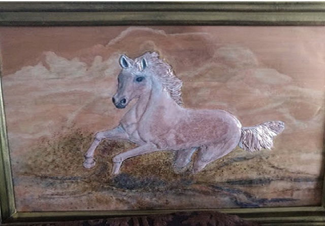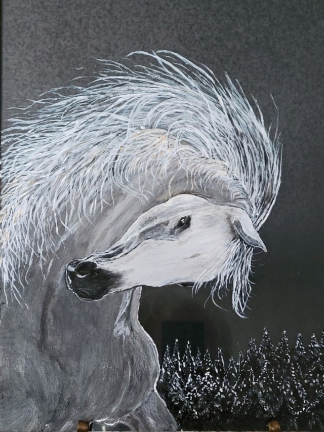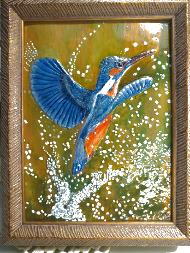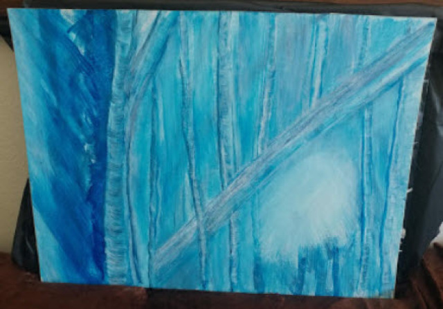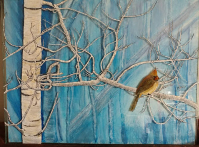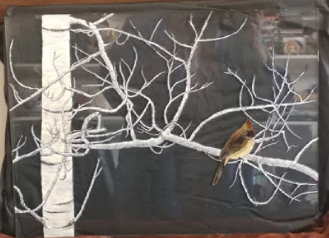 An idea drawing and painting of a Female Cardinal setting on a birch tree branch that is in cold winter. This painting is on a piece of glass 12 by 16. A painted removable background in blue and white. The whites are painted in Pabelo Vitrail. This paint almost glows in the dark when light shines the paint. Background can be changed to different colors for different times of the seasons.