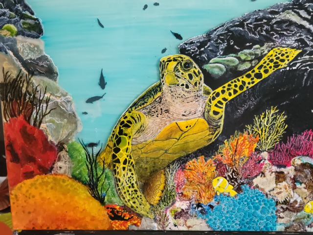 Sea Turtle on glass using Procelaine, Glass and Acrylic Ink combined with Pebeo Porcelaine - will be in dual pain glass with a hard spaced back matt.
